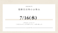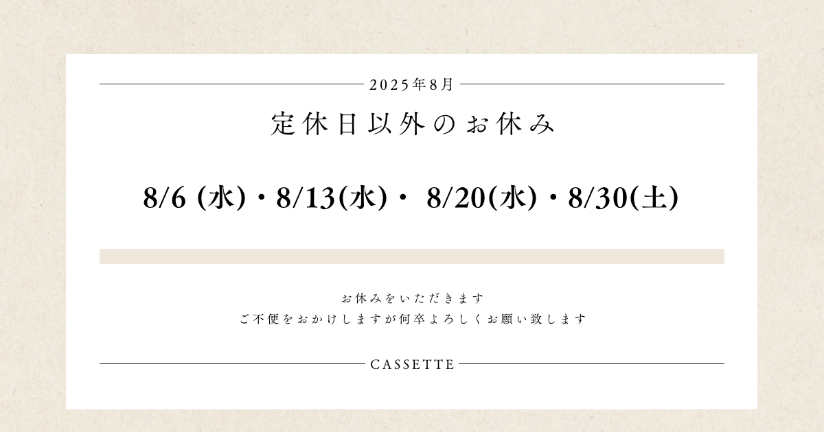 2025年8月のお休み 2025.08.02 火曜日 8/5・8/12・8/19・8/26 臨時休業 8/6(水)8/13(水)8/20(水)8/30(土) 誠に勝手ながら、上記の日程において休業させていただきます。 ご不便をおかけしますが何卒よろしくお願い致します