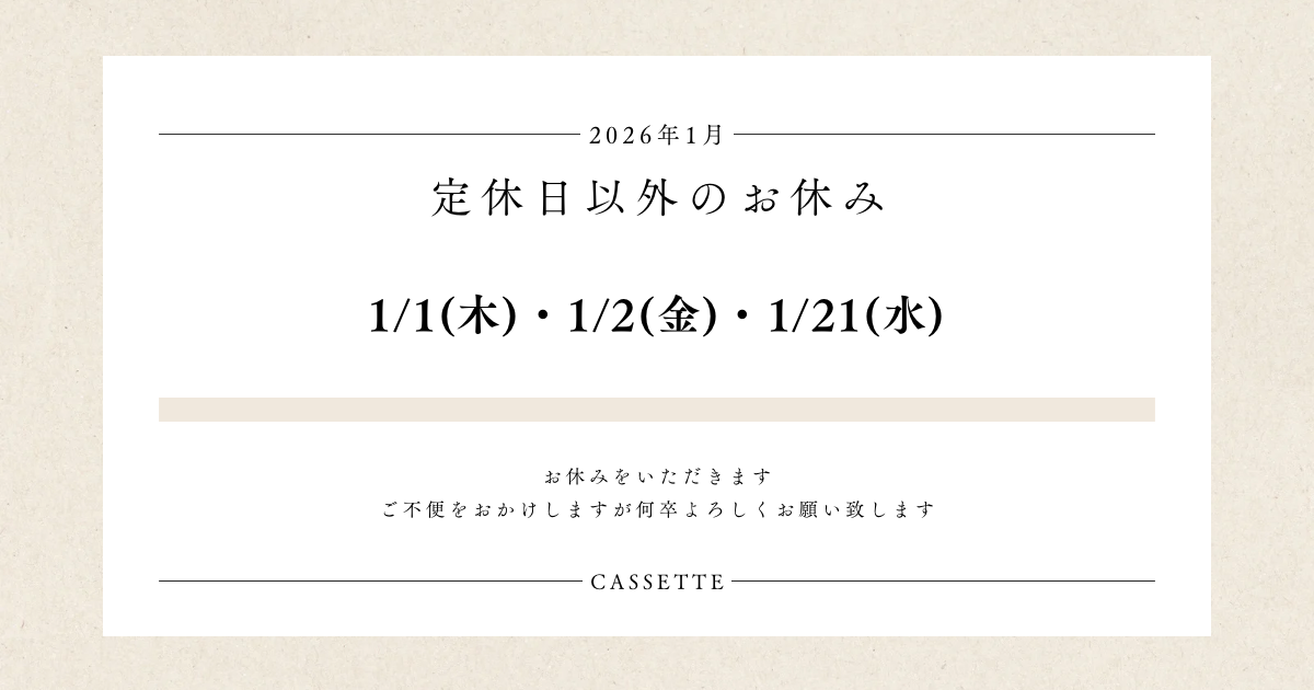 2026年1月のお休み 2025.12.25 火曜日 1/6・1/13・1/20・1/27 臨時休業 1/1(木)・1/2(金)1/21(水) 誠に勝手ながら、上記の日程において休業させていただきます。 ご不便をおかけしますが何卒よろしくお願い致します。