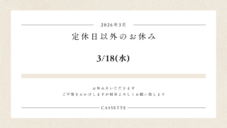 お知らせ 2026年3月のお休み 火曜日 3/3, 3/10, 3/17, 3/24, 3/31 臨時休業 3/18(水)誠に勝手ながら、上記の日程において休業させていただきます。ご不便をおかけしますが何卒よろしくお願い致します。 2026.03.02 お知らせ